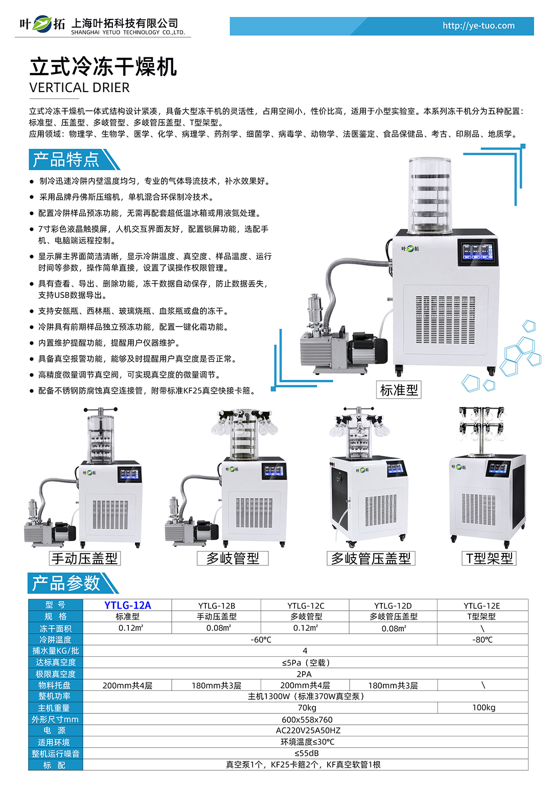 上海葉拓 YTLG-12A 立式凍干機的產品特點: